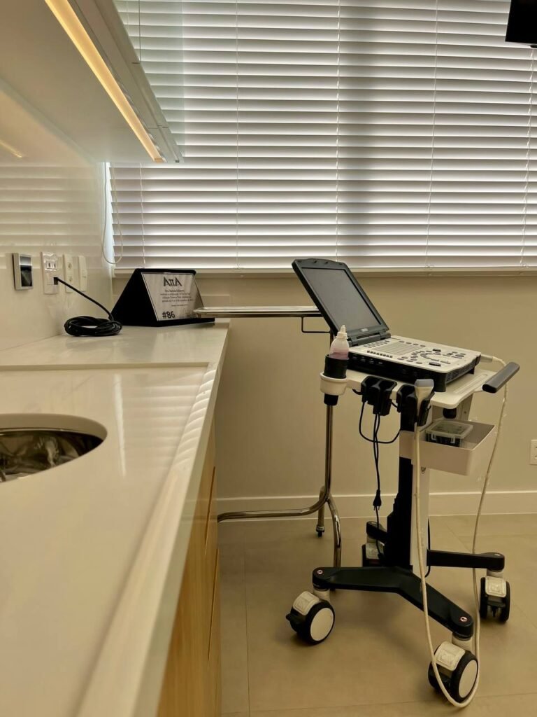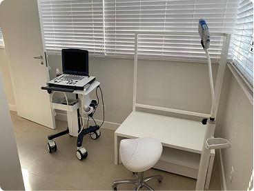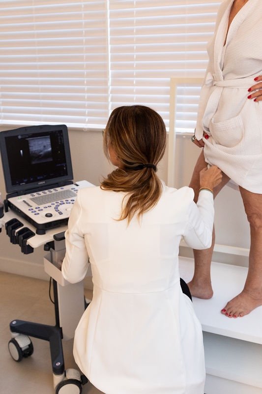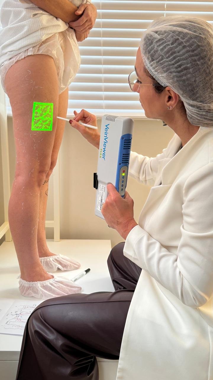 Na clínica, começamos com uma avaliação vascular completa, que inclui ultrassonografia vascular com eco-Doppler e realidade aumentada para mapear as veias.