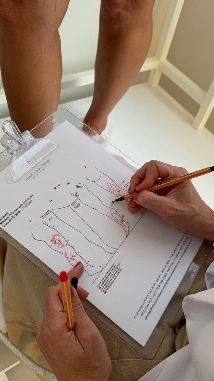 Nessa avaliação, realizamos ultrassonografia vascular com eco-Doppler, utilizamos realidade aumentada para mapear as veias superficiais e fazemos o mapeamento venoso detalhado.