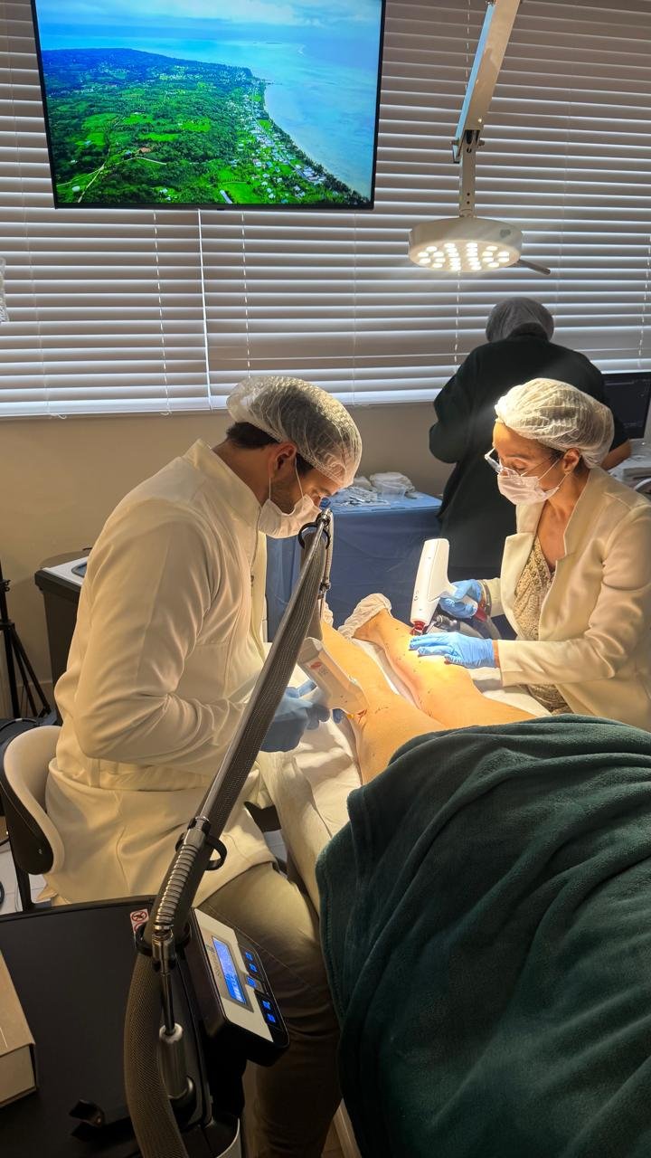 As diretrizes atuais reconhecem o endolaser como opção preferencial para tratar refluxo da safena entre as técnicas minimamente invasivas. Após a ablação, realizamos controle por ultrassom e, quando necessário, seguimos para as etapas de refinamento (por exemplo, laser transdérmico para vasinhos).